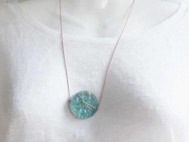 ユラユラゆれる波間を樹脂で表現しました。3点留めた海にナチュラルな革紐を通し、胸元で映える素敵なネックレスにしました