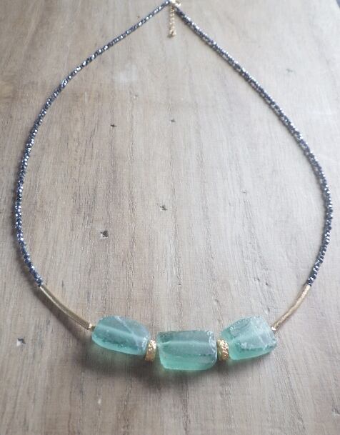 海を思わせるアクアグリーンがとても美しいローマングラスと肩こりに効くといわれるテラヘルツをふんだんに使ったスペシャルなネックレスです