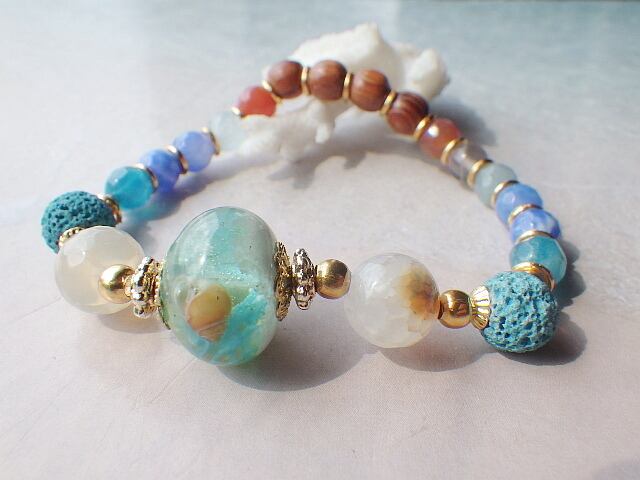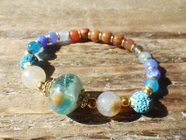 海中にいるようなビーズをアクセントにしてサイドにドラゴンアゲートとブルーの溶岩石であるラヴァストーンを配置し、サンセットを思わせる夕日色のアゲートと海のようなグラデーションに並べたアゲートにウッドビーズをあわせました
