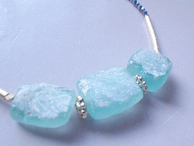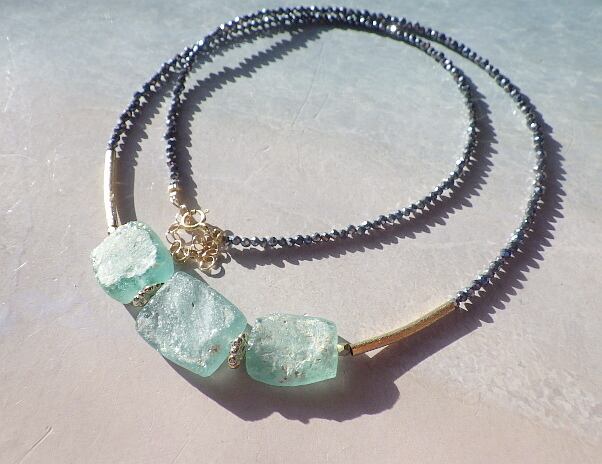 海を思わせるアクアグリーンがとても美しいローマングラスと肩こりに効くといわれるテラヘルツをふんだんに使ったスペシャルなネックレスです