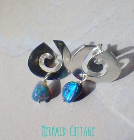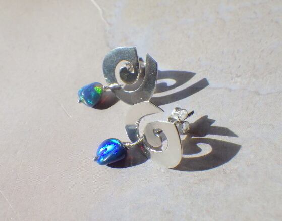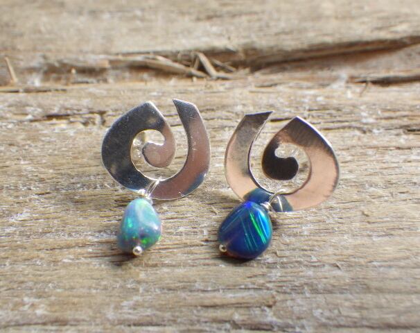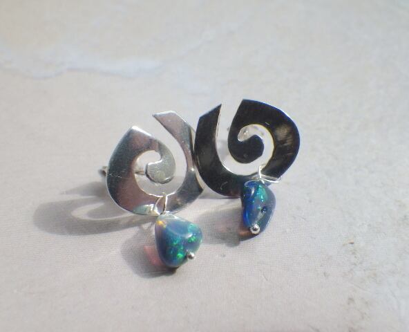 ユニークな波の渦巻きとそこからこぼれる海の雫のようなブラックオパールのシルバースタッドピアスです 、