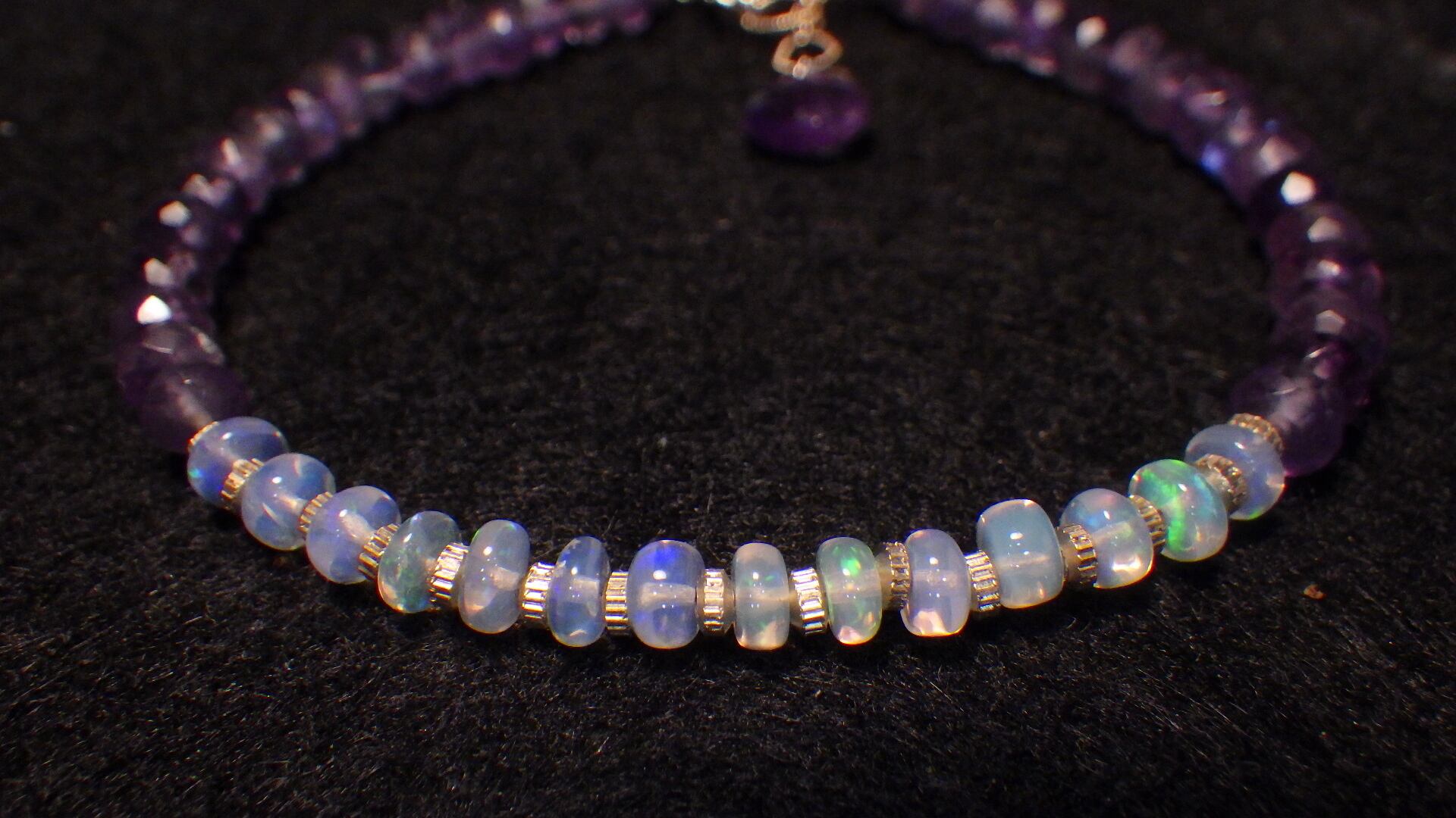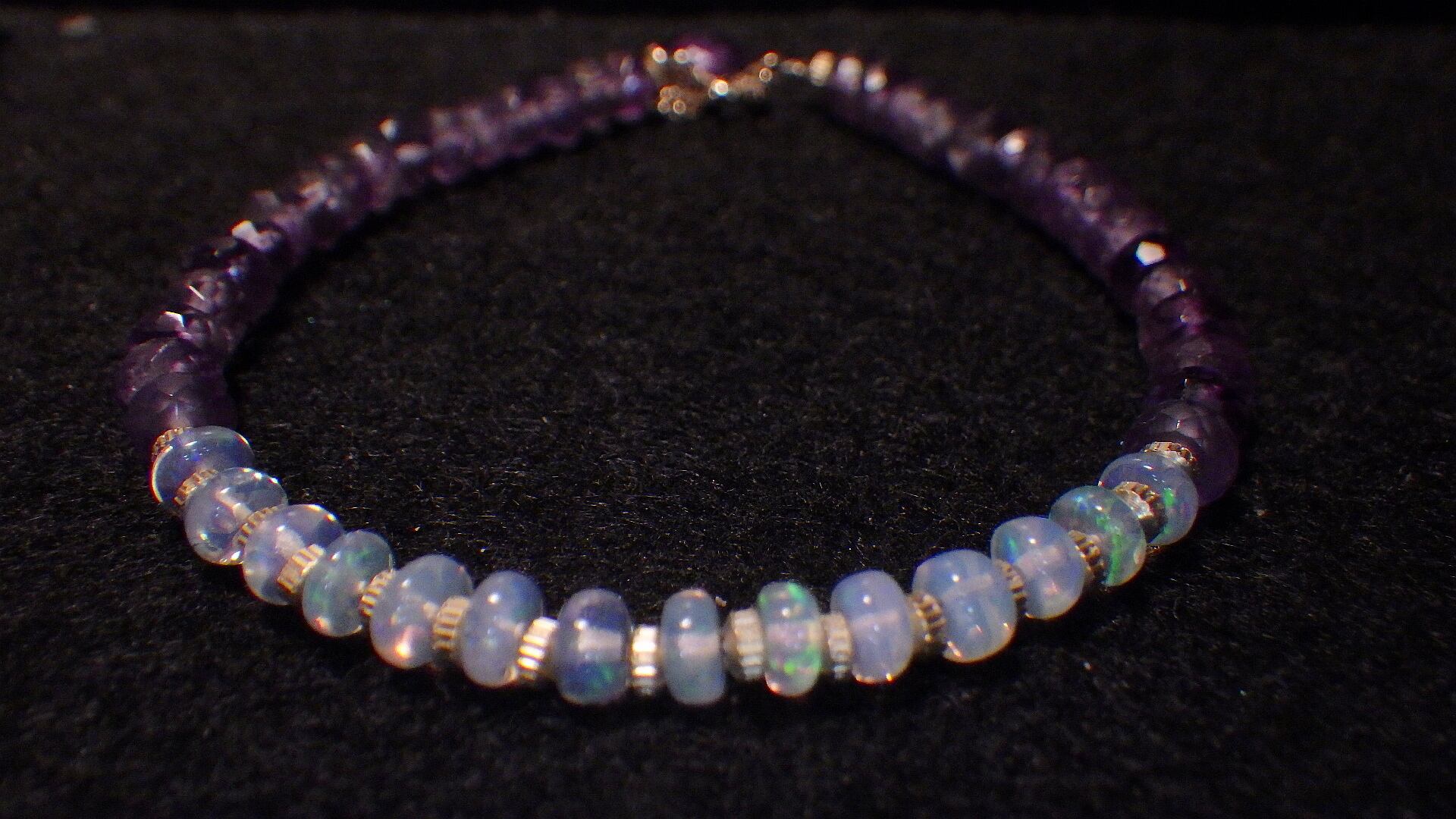 そんなプレシャスオパールを愛の守護石として知られるアメジストにふんだんに散りばめたとっても美しいブレスレットです