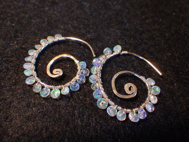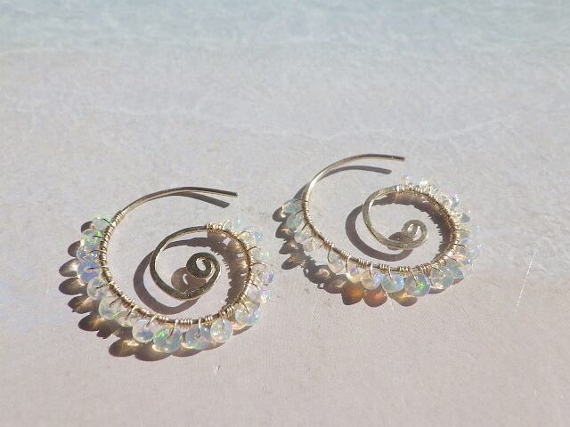 そんな美しいプレシャスオパールのビーズを丁寧にゴールドフィルドワイヤーで渦巻きのピアスに巻きつけ、虹色のオパールが這う