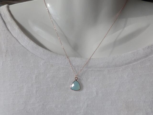穏やかな海を思わせるブルーが綺麗な三角シェイプのカルセドニーの14kgfローズゴールドフィルドチェーンネックレスです