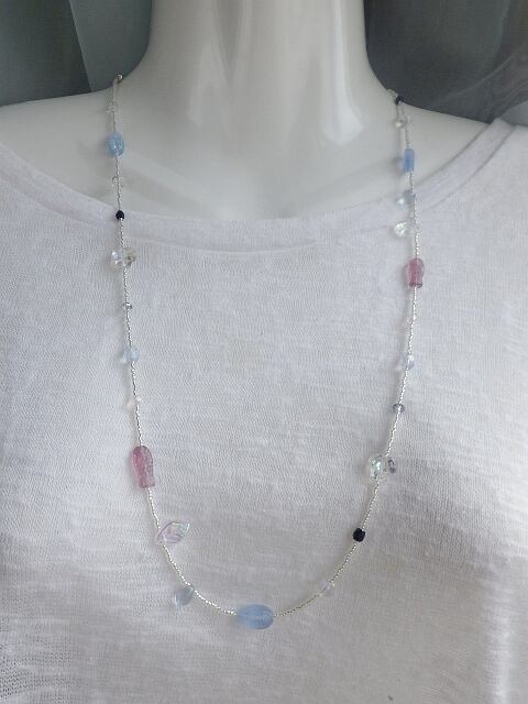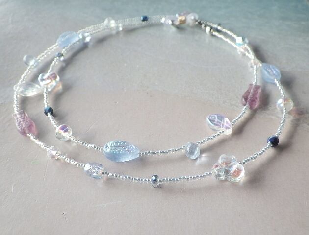 シルバーのビーズを基調にしてところどころ散りばめたチェコビーズやアンティークガラスのメタリックな輝きがとても美しく