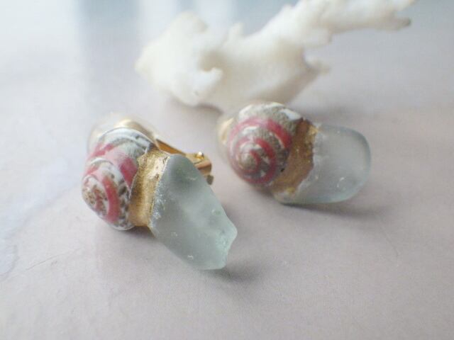 サーモンピンクのうず巻きシェルとシーグラスの金継ぎイヤリング☆蝶バネ