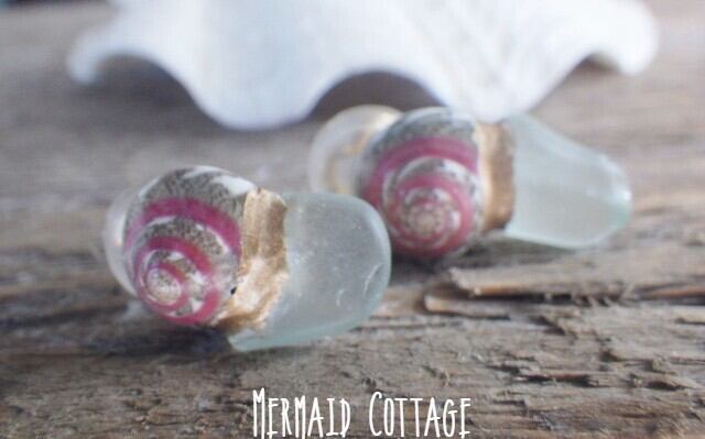 可愛らしいサーモンピンクの渦巻き貝と浜辺で拾ったシーグラスを和の伝統、金継ぎで繋ぎ合わせた