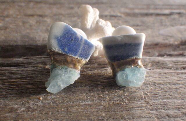 浜辺で拾ったシー陶器に「海の水」を意味するアクアマリンの原石をあわせ