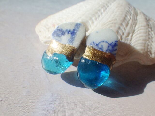 海を切りとったようなとても綺麗なブルーに小さなシー陶器をあわせ、小ぶりながら耳朶に海!の存在感☆