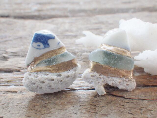 何年も波に洗われ丸くなった可愛らしいシー陶器の欠片と珊瑚の欠片で人魚の涙、シーグラスwpサンドイッチし金継ぎで繋げました