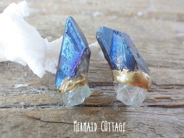 チタニウム水晶とアクアマリンの金継ぎピアス