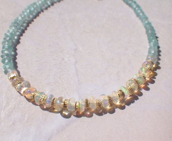 遊色が素晴らしく綺麗なオパールがアパタイトの海のようなアクアブルーに溶けこんでいるようで、ビーチィで繊細でとても素敵です!