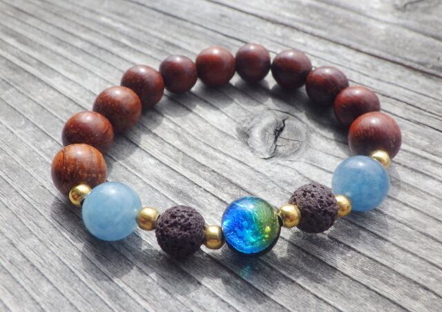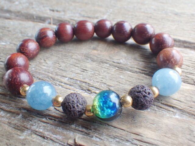 海のような色のアクアマリンの丸玉を並べてウッドビーズをつなぎました