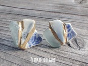何年も波に洗われ丸くなった可愛らしいシー陶器の欠片と人魚の涙、シーグラスを金継ぎで繋げました