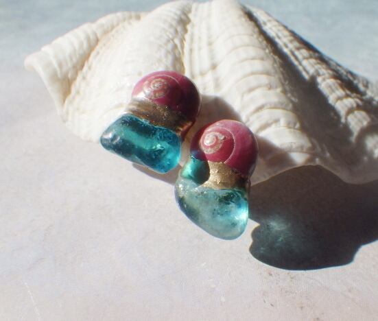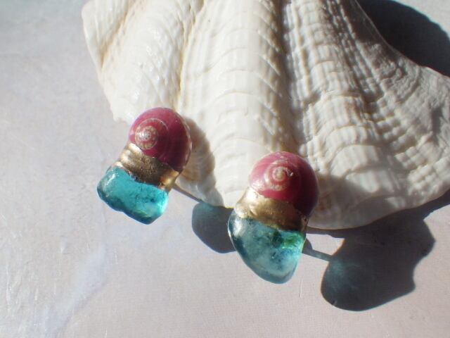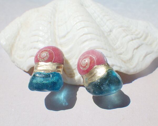 可愛らしいサーモンピンクの渦巻き貝と青の洞窟を思わせるブルーのガラス玉を