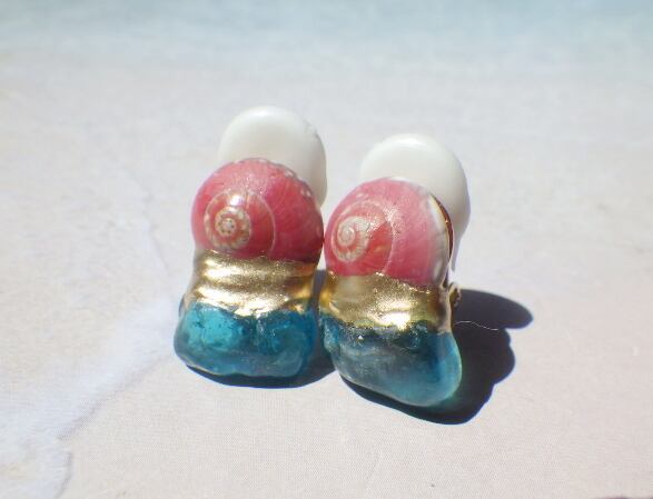 Grotta Azzurra サーモンピンクのうず巻きシェルと青の洞窟の金継ぎイヤリング☆蝶バネ