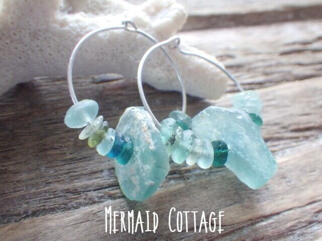 穏やかな海をイメージして、丸いシェイプのローマングラスとシーグラス(ビーチグラス)のような質感とお色のローマングラスを