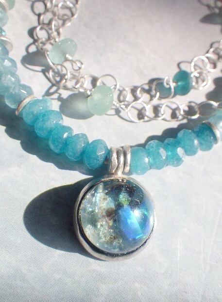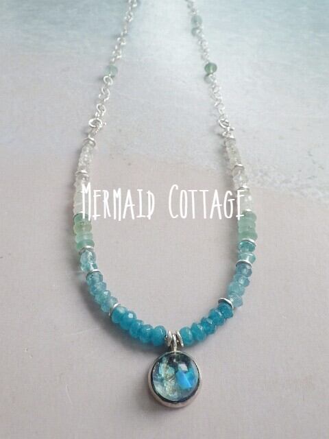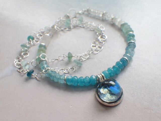 ひとつは、小さなアゲートとアパタイト、ローマングラス、ムーンストーン、クウォーツをふんだんに使って海のグラデーションを表現した