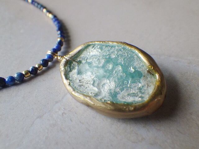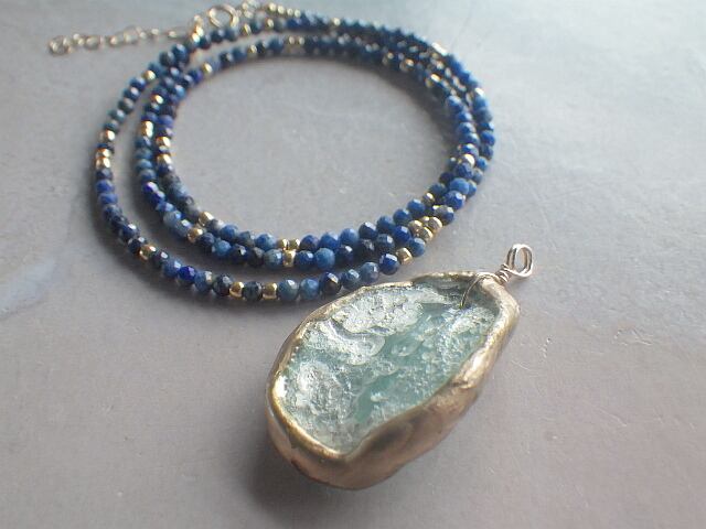 3WAY☆銀化☆金フレームのローマングラス☆ラピスラズリネックレス *14kgf*Ancient Romanglass Necklace