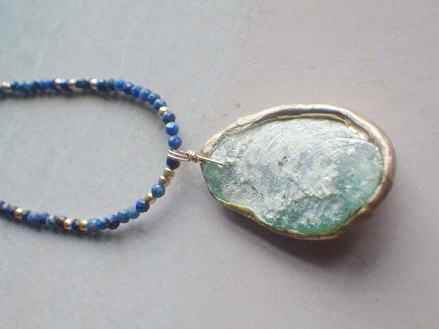 ローマングラスを引き立てるネックレス部分のラピスラズリのひとつひとつには、大変細かなカットが施され