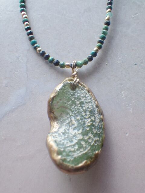 クリソコラの小さなビーズとあわせローマングラスンの美しさを最大限に際立てたネックレスにしました