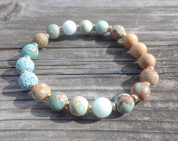 ビーチカラーの珍しいシーセディメントジャスパーにブルーの海色のラヴァストーンとサイプレス(ヒノキ)をあわせた