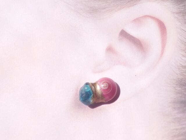 可愛らしいサーモンピンクの渦巻き貝と青の洞窟を思わせるブルーのガラス玉を