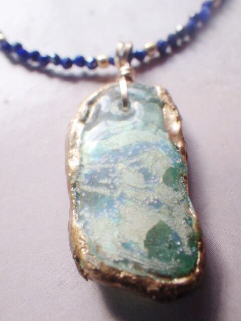 ネックレス部分は極少のラピスラズリビーズ、ターコイズとあわせローマングラスの美しさを最大限に際立てました