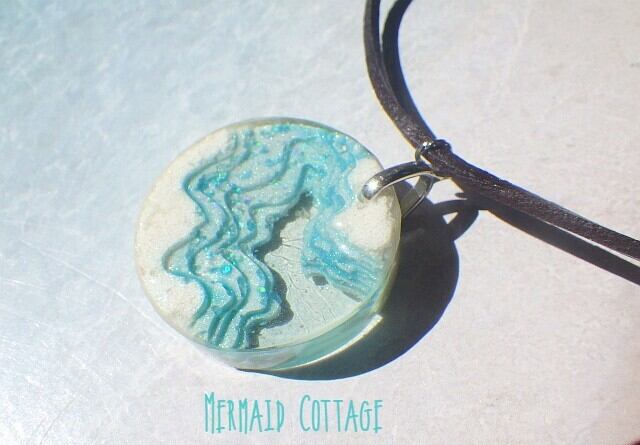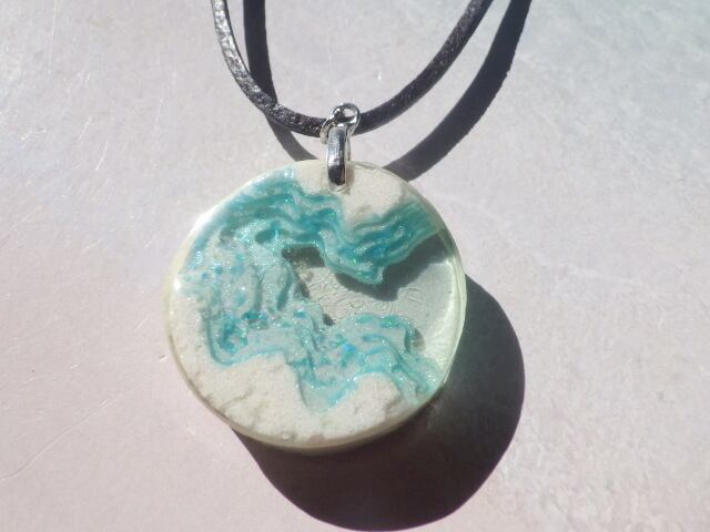 どこかの南の島の白い砂浜の奥にあるラグーンを白砂と樹脂で作りペンダントにしました