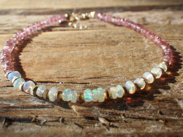 美しい夕日色のピンクトルマリンと幸せを呼ぶといわれる愛の石、オパールが輝く愛に満ちたブレスレットです