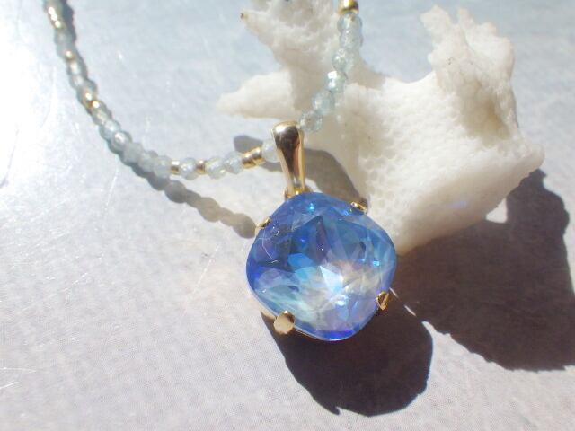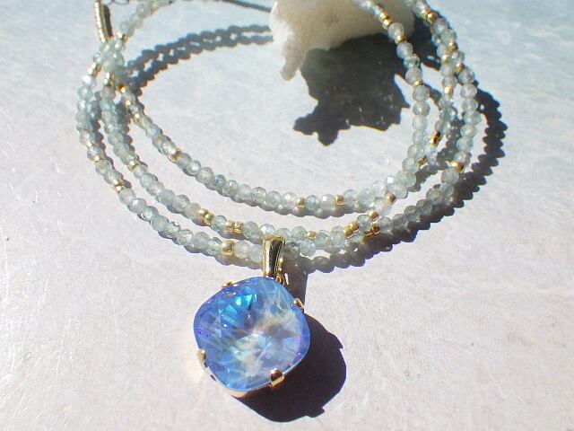 オーシャンディライトのトップを引き立てるネックレス部分のアパタイトのひとつひとつには、小粒ながらもとても大変細かなカットが施されており