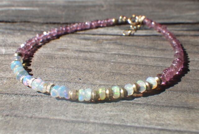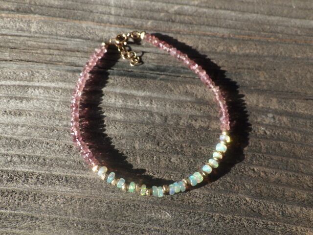 美しい夕日色のルベライトと幸せを呼ぶといわれる愛の石、オパールが輝く愛に満ちたブレスレットです