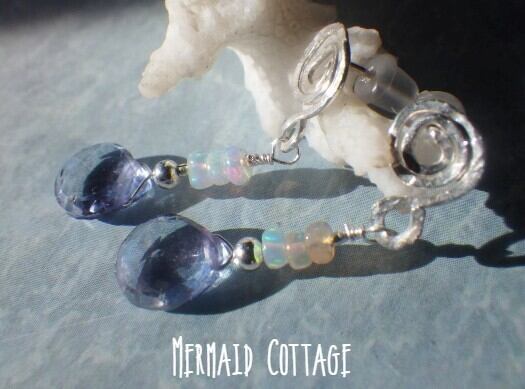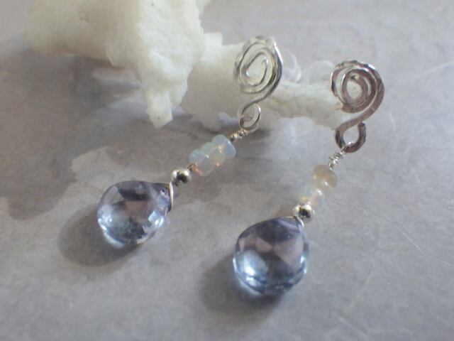 耳朶で輝く渦巻きからプレシャスオパールとミスティッククウォーツが素敵なハーモニーが奏でるロマンティックなピアスにしました