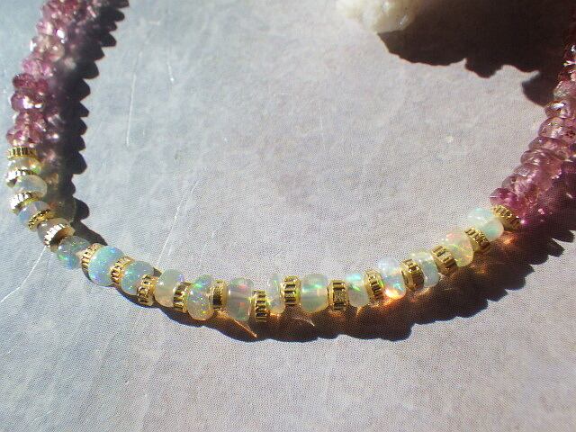 思わず見とれてしまう美しいプレシャスオパールをピンクトルマリンの間にふんだんに散りばめました