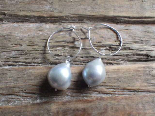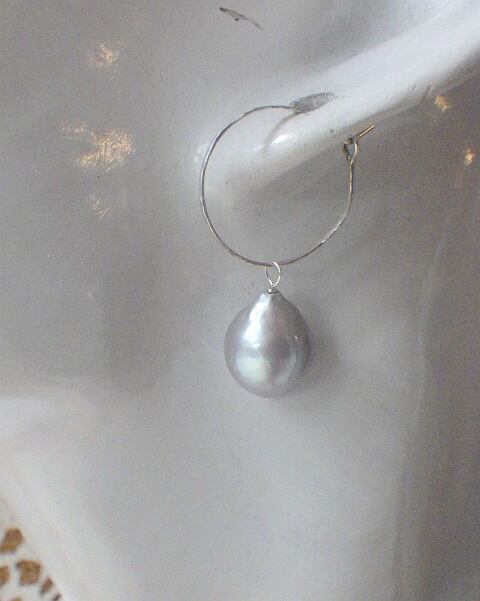 *sv925*シルバーグレーバロックパールのシルバーフープ☆槌目ハンマー打ち