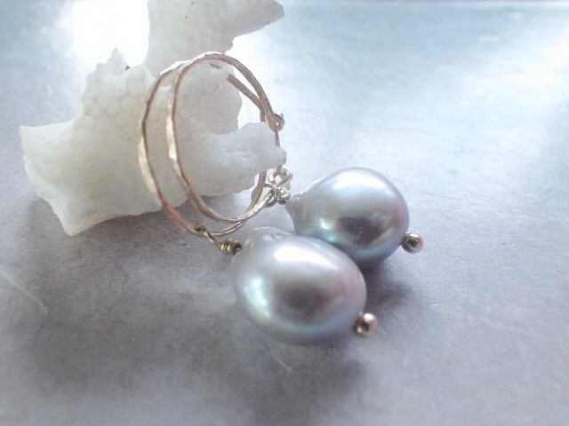 *14kgf*シルバーグレー♡バロック淡水パールのゴールドフープ☆槌目ハンマー打ち