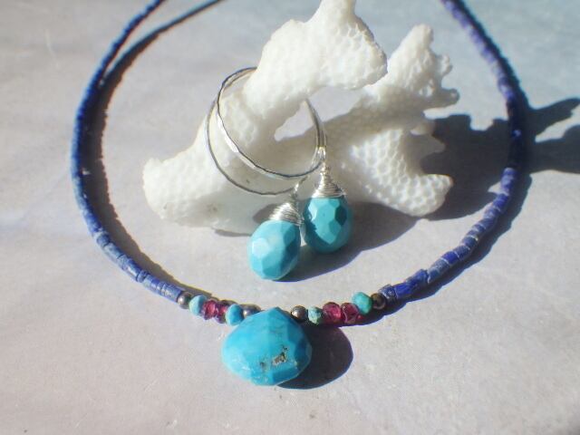 12月の誕生石ターコイズとラピスラズリの総天然石のネックレス&ターコイズのフープピアスです