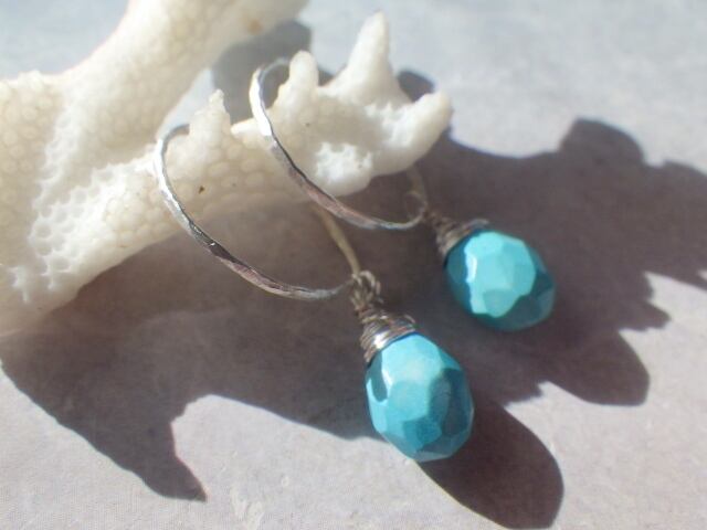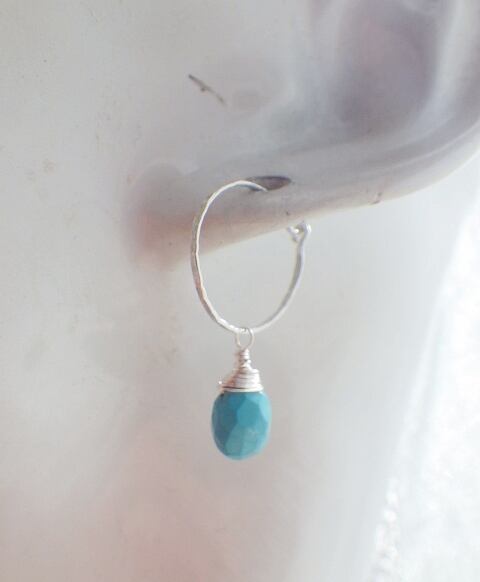 お揃いのターコイズの一粒ピアスはフープに揺れるブルーのターコイズのみ下がるデザインでシンプルの極み!