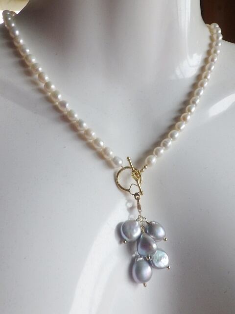 そんな美しいバロック淡水パールを贅沢に5粒をチェーンに施して束ね、取り外しの出来るトップにしました