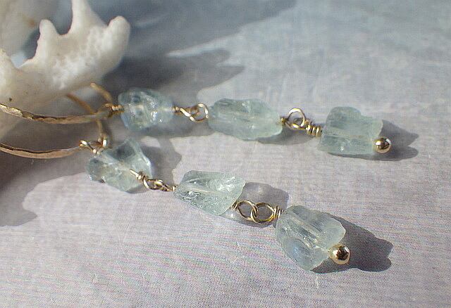 *14kgf*Tiny Raw Aquamarine アクアマリン原石のつらなりフープピアス☆槌目