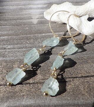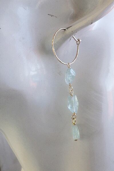 海をすくったようなアクアマリンの原石が3つ、つらなるとても美しい14kgfのフープピアスです