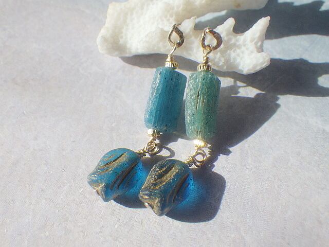 ビビットなブルーのローマングラスとチェコガラスの異なるブルーにゴールドが交じり合い、高級感の中にぬくもりのある仕上がりに。