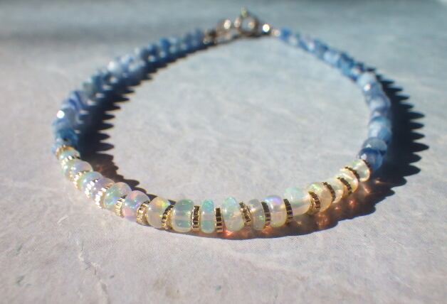 そんなプレシャスオパールを美しい群青色の天然カイヤナイトの間にふんだんに散りばめた優美なブレスレットです