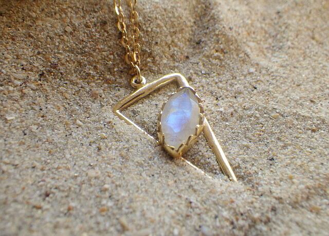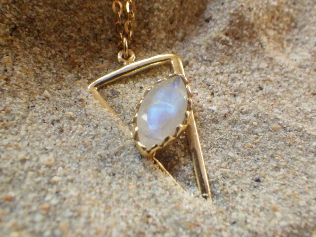 長細い逆三角形の内側にセットされた目のようなシェイプのムーンストーンはブルーと虹のように輝く独特のシラーが