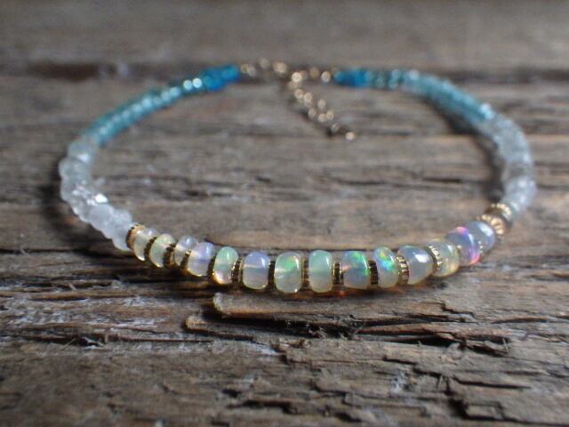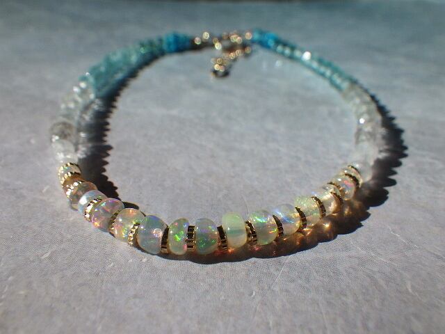 そんなプレシャスオパールをアクアマリンとアパタイトの間にふんだんに散りばめた優美なブレスレットです