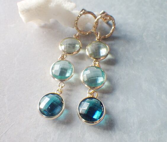 キラキラとしたテクスチャーが味のあるサークルスタッドピアスから零れ落ちる海の滴のように連なるグラスーストーン