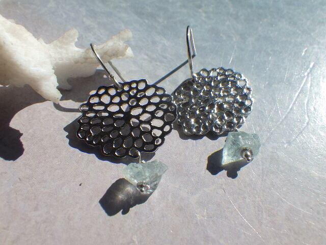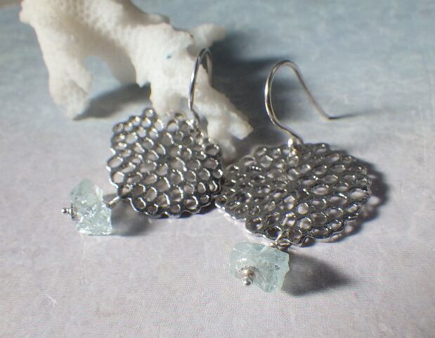繊細なウミウチワ(Sea fan)アクアマリン原石が耳元でがキラリ☆揺れる存在感のある爽やかピアスです