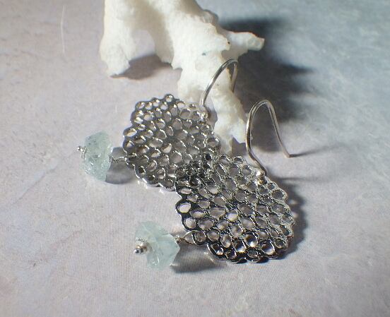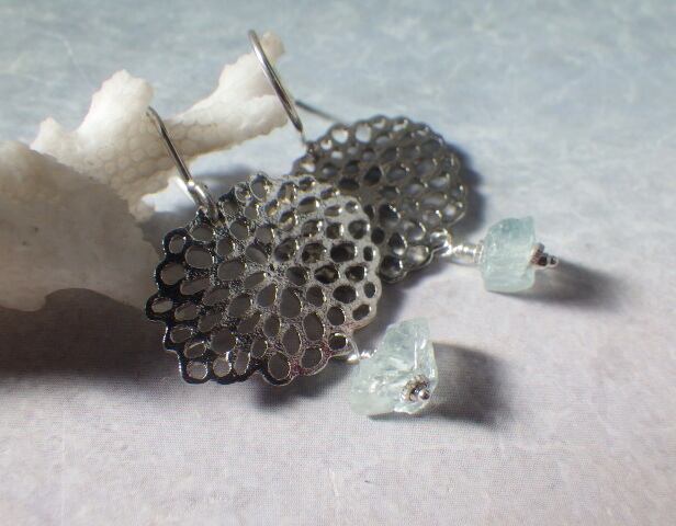シルバーの繊細なウミウチワのフィリグリーに海をすくったような小さなアクアマリンのラフロックをひと粒下げました