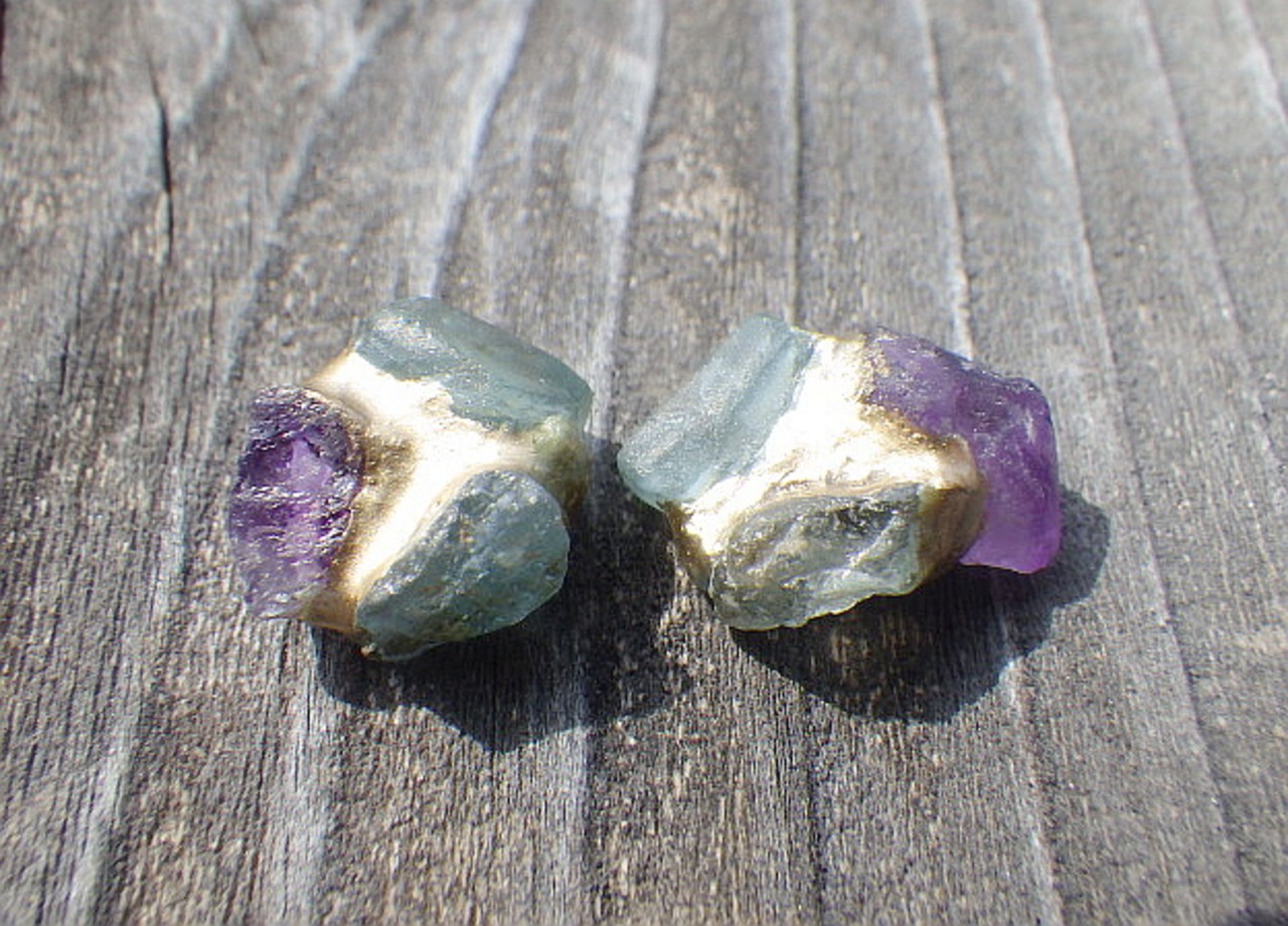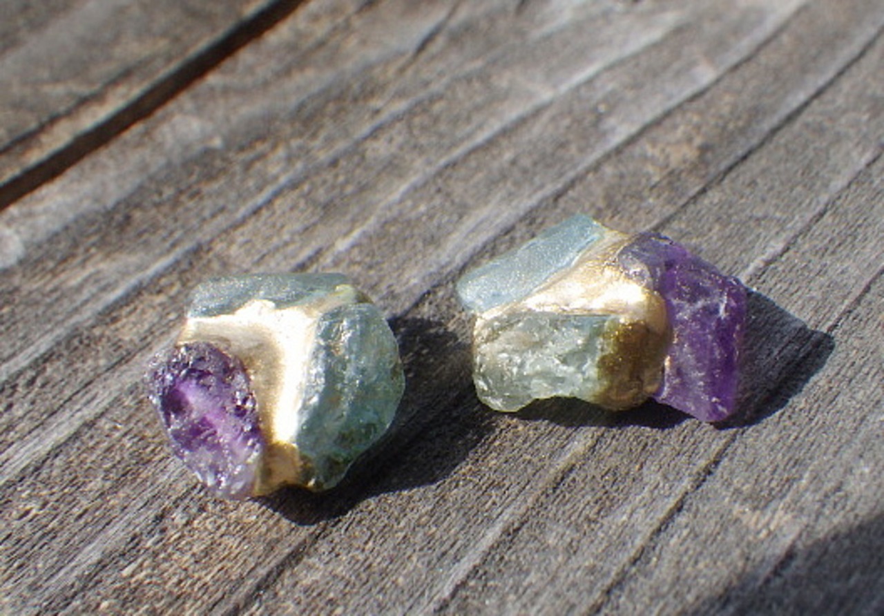 愛の石で知られるアメジストとアクアマリンとアパタイトの原石を和の伝統、金継ぎしてあわせました