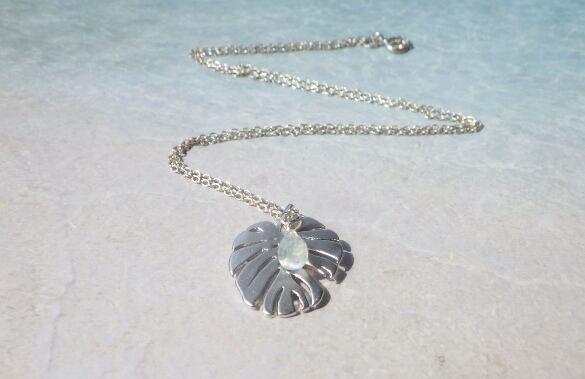 モンステラと朝露のようなブルームーンストーンがとても綺麗で繊細なネックレスです